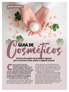 C ada vez mais em alta entre consumidores conscientes, os cosméticos veganos estão com tudo. Xampus, hidratantes, sabonetes e todo tipo de produto para maquiagem caíram na preferência de quem exige ética por parte das empresas em relação aos animais. Por isso, cosméticos que foram testados em animais ou contêm ingredientes de origem animal sequer são levados em consideração por esse público, que cresce a cada dia. Um relatório da Euromonitor International, empresa de pesquisa de mercado, descobriu que o termo “vegano” foi o terceiro mais popular listado por marcas de maquiagem com vendas on-line . O termo de pesquisa foi superado apenas por “sem parabenos” e “natural”. Graças ao sucesso de marcas e linhas de maquiagem vegana, muitas empresas famosas, afirma a Euromonitor em seu relatório, já estão “veganizando” seus produtos em resposta a esse tipo de demanda. Neste guia, você confere algumas das marcas de cosméticos que oferecem uma gama completa de produtos de beleza feitos para consumidores que realmente se importam com os animais. Se quiser saber mais sobre empresas de cosméticos que oferecem esses produtos para veganos, sites de organizações ativistas de proteção animal, como PEA (pea.org.br) , no Brasil, e PETA (peta.org ), nos Estados Unidos, são boas fontes. Cosméticos GUIADE guiadecosméticos Dezenas de opções de produtos veganos para o seu bem-estar, beleza e higiene pessoal