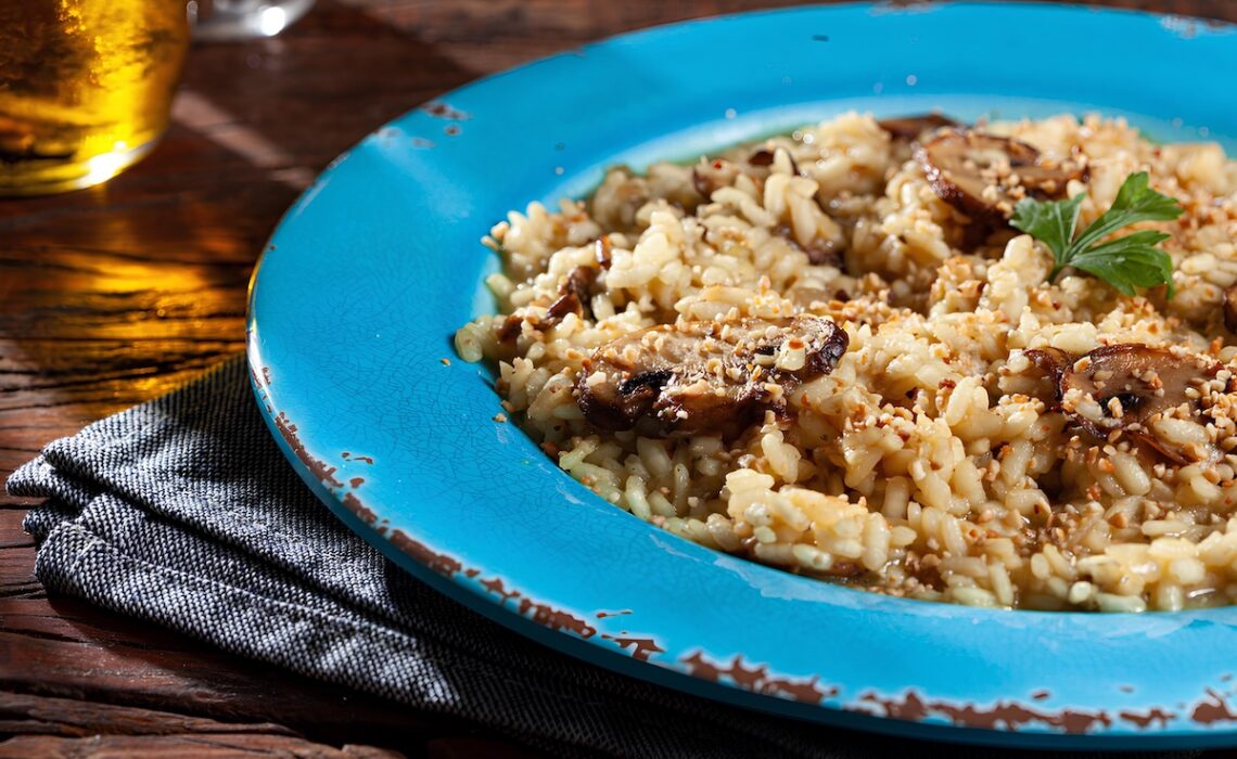 Deixe a castanha em 1 xícara de água hidratando por aproximadamente 4h. Após esse tempo, bata no liquidificador até virar um creme. Reserve. Em uma panela, aqueça o azeite e doure a cebola e o alho em fogo médio. Acrescente os cogumelos fatiados e refogue até dourar. Junte o arroz e vá adicionando o caldo de legumes quente e o vinho aos poucos, mexendo sempre. Quando o arroz estiver cozido, adicione o creme de castanha, acerte o sal e a pimenta-do-reino. Decore com castanha-de-caju triturada.